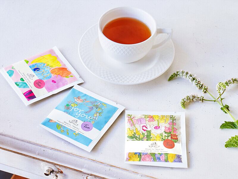 ブラックティーは北野 里佳さんの「花束」のアートワークがデザインされたパッケージ。